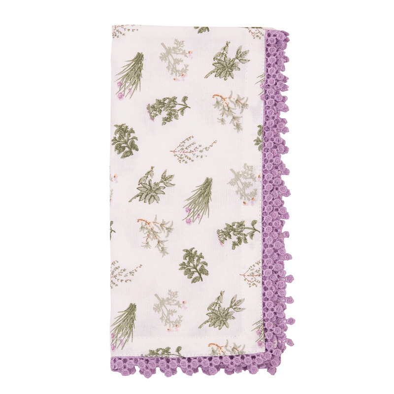 Jemný textilný obrúsok "Bylinky z Provence" - biely podklad s potlačou byliniek a krajkový fialový lem.