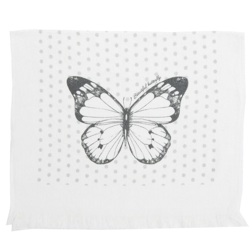 Bavlnený kuchynský uteráčik - biely s bodkami a obrázkom motýlika.
