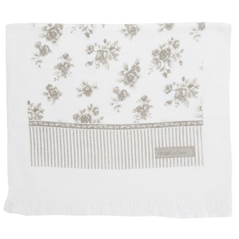 Bavlnený uteráčik so vzorom ruží v béžovej farbe na bielom podklade.