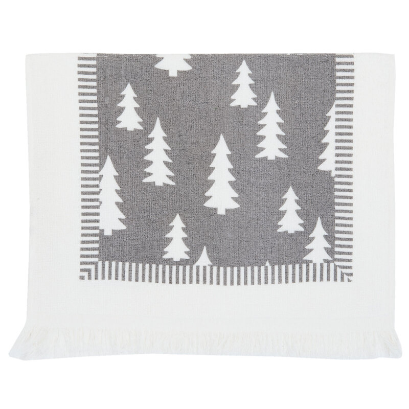Kuchynský bavlnený uteráčik so sivým podkladom a vzorom stromčekov.