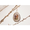 Krásna veľkonočná dekorácia v tvare vajíčka s motívom zajačika. Vajíčko je plechové, zavesené na jutovom špagáte ozdobené gorálkou. Veľkosť.... cm.