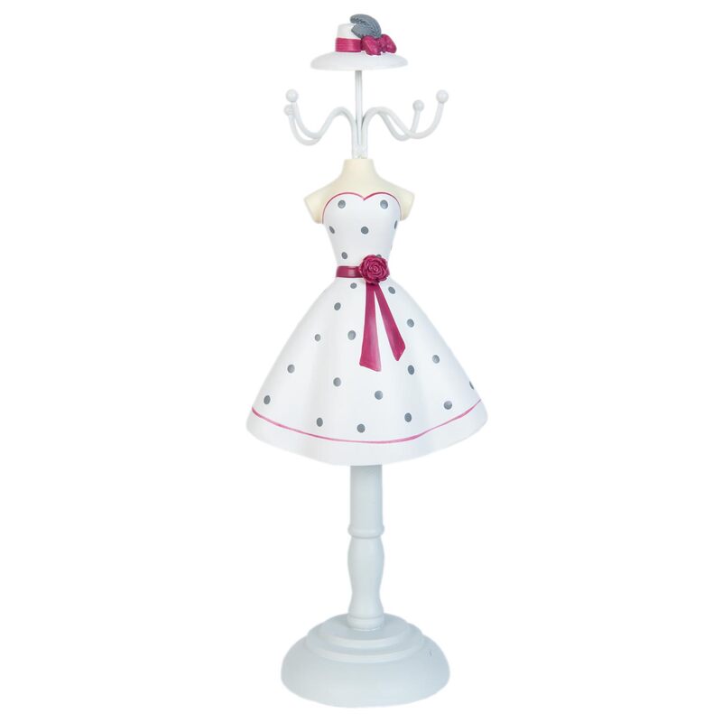Vešiačik na šperky - šperkovník - biely so sivými bodkami, ktorý krásne vynikne a skvele poslúži. Má niekoľko ramien, na ktoré si môžete zavesiť náramky, náušnice i náhrdelníky.