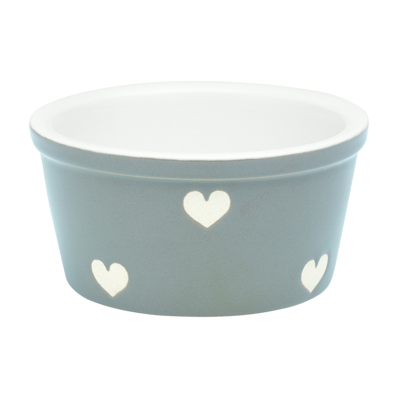 Zapekacia keramická miska od dánskej značky Green Gate. V sivej farbe s bielymi srdiečkami sa dá použiť na zapekanie dezertov ale aj malých pokrmov. Možno ju umývať v umývačke riadu.