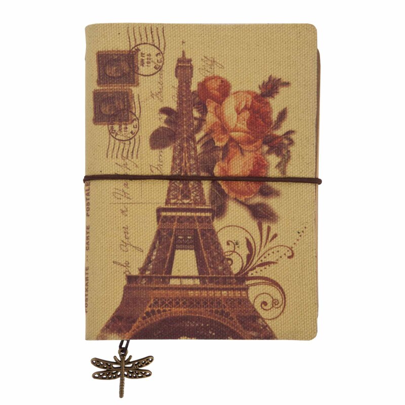 Romantický zápisník s látkovou potlačou, na prednej strane s obrázkom z Paríža. Obsahuje 160 papierových strán prírodnej farby- polovica strán je s riadkami a polovica je čistá, obsahuje i dva plastové obaly napr. na doklady. Zápisník má záložku s kovovou vážkou.