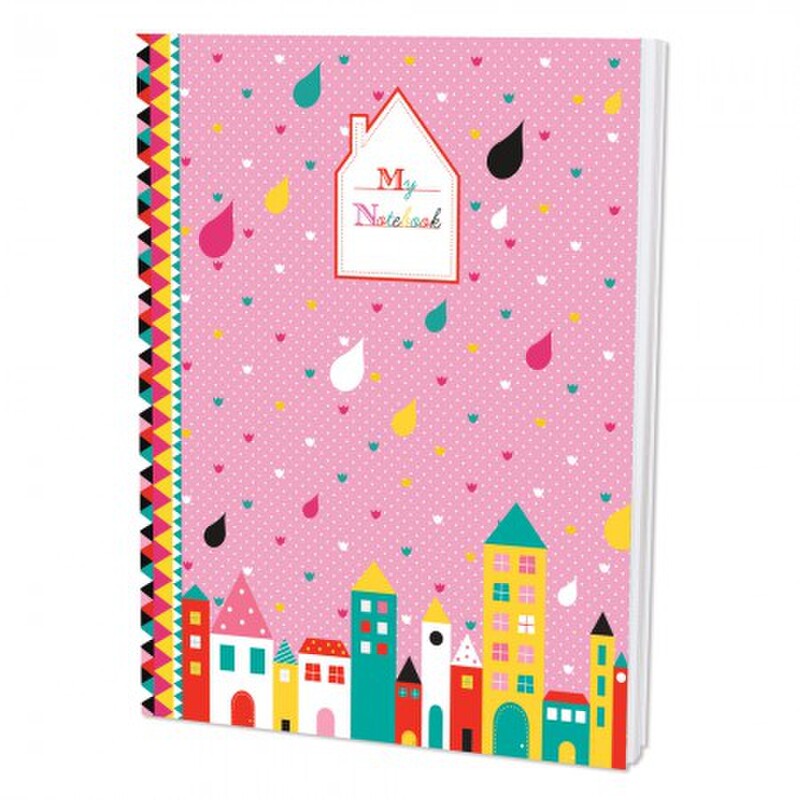 Krásny farebný zápisník, linajkový - ružový podklad s domčekmi a farebnými kvapkami. Obsahuje 96 strán.Listy sú biele s jemnými sivými bodkami. Zápisník je navrhnutý francúzskou dizajnérkou.