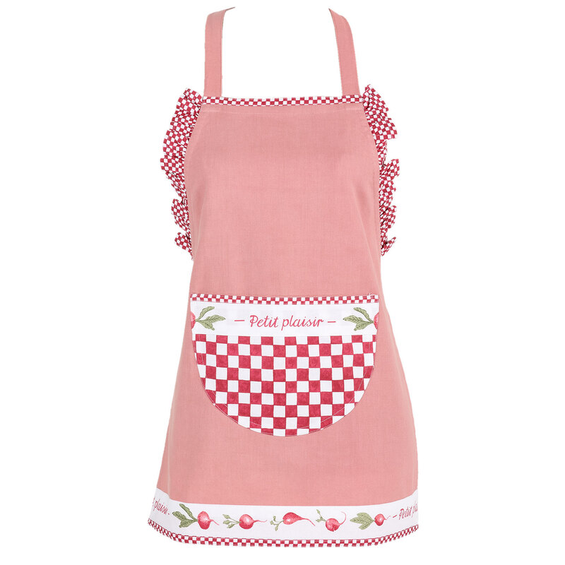 Rozkošná zásterka pre deti - tmavoružová s kockovaným vreckom a reďkovkovým lemom. Uväzuje sa v zadnej časti na mašľu.