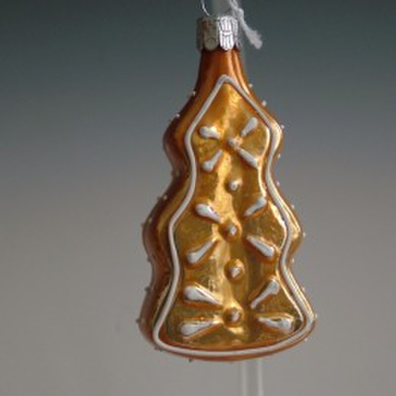 Klasická sklenená ručne vyrobená a maľovaná ozdoba - perník/stromček s polevou, hnedý, lesklý.