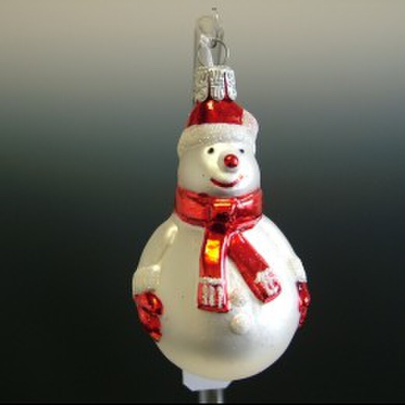 Klasická sklenená ručne vyrobená a maľovaná ozdoba - snehuliak s červeným šálom.
